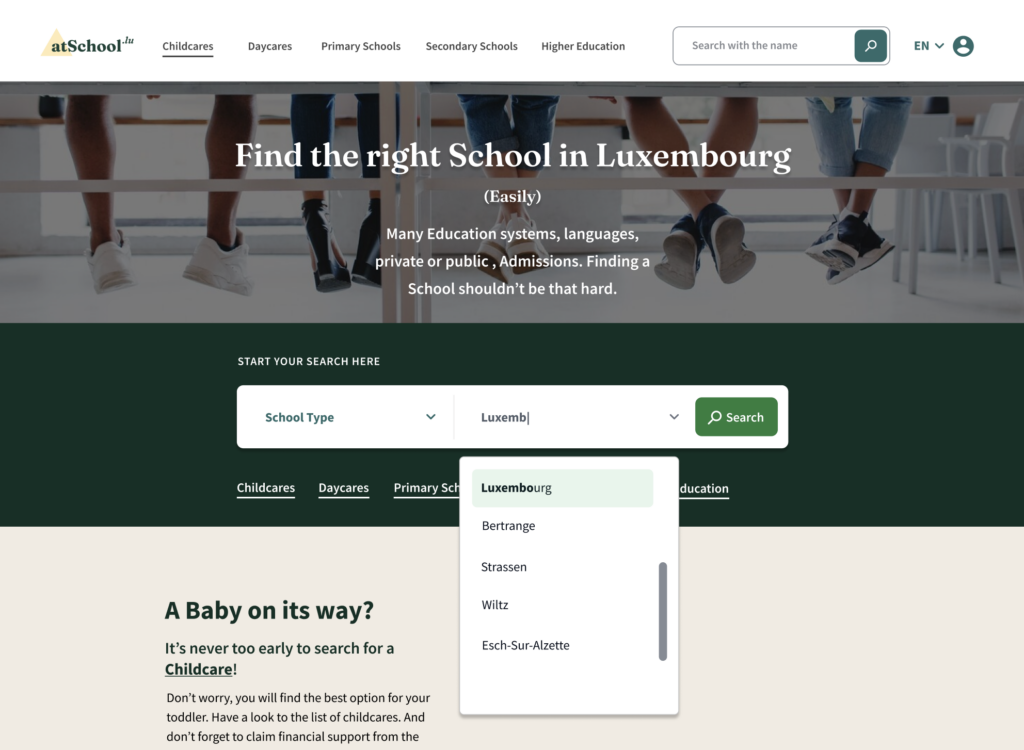 Full platform design, branding identity and UX for a school search platform in Luxembourg. Business Model and Marketing Strategy.